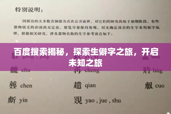 在未来的探索中,我们还将发现更多的生僻字和它们背后的故事,百度搜索引擎将继续陪伴我们在这条道路上前进,为我们提供丰富的信息和实用的工具,让我们共同期待这场生僻字的探索之旅,感受汉字的无穷魅力。