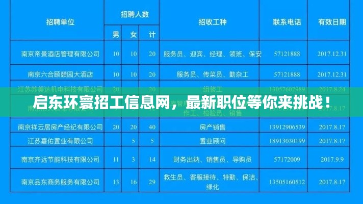 随着经济的发展和社会的进步,启东地区的企业规模逐渐扩大,对于人才的需求也日益增加,启东环寰招工信息网作为一个重要的招聘信息发布平台,为广大求职者提供了丰富的就业机会,本文将详细介绍启东环寰招工信息网的最新招聘情况,帮助求职者了解当前的就业市场,为自己的职业发展做出明智的选择。