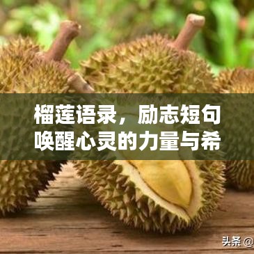 榴莲作为一种独特的果实,给我们带来了许多启示,面对生活中的挑战和困难,我们要勇敢地破壳而出,迎接新的生活,正如榴莲树需要经历风雨才能结出美味的果实,我们也要在人生的道路上不断成长和进步,这些励志短句将唤醒您心灵深处的力量,激发您追求梦想的勇气,让我们共同前行,在榴莲的启示下勇往直前!