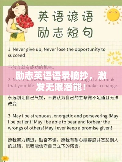 1、"Learning is a treasure that will follow its owner everywhere." —— Chinese proverb (学习是随身携带的宝藏。) 这句话鼓励我们不断学习,因为知识是我们最宝贵的财富,无论是在学校还是在生活中,我们都能从学习中找到力量,无论遇到什么困难,通过学习,我们都能找到解决问题的方法,学习不仅能帮助我们获得知识,还能提升我们的思维能力,使我们变得更加聪明和有智慧,我们应该珍惜学习的机会,不断地充实自己,当我们在学习中投入时间和精力时,我们会发现,学习本身就是一种乐趣和享受,通过学习,我们能够开阔视野,拓宽思维,不断提升自己的能力和价值,让我们坚持学习,让知识的力量推动我们不断前进,六、关于人生哲理与启示 1. "Life is like a box of chocolates, you never know what you're gonna get." —— Forrest Gump (人生就像一盒巧克力,你永远不知道你会得到什么。)这句话提醒我们人生的无常和不确定性,我们无法预测未来会发生什么,但我们可以选择如何应对和适应这些变化,我们应该珍惜每一个当下,把握每一个机会,因为每一个经历都是一次学习和成长的机会,我们也应该保持谦逊和开放的心态,接受生活中的挑战和困难,只有这样,我们才能真正地享受人生的美好和丰富多样性。 这些励志的英语语录摘抄为我们提供了关于梦想、勇气、挑战、自信、学习和人生哲理等方面的智慧,希望这些语录能够激励你在人生的道路上勇往直前,不断追求进步和成长,无论你遇到什么困难和挑战,都要相信自己有能力克服它们,你的潜力是无限的,只要你愿意付出努力和坚持,你就能实现你的梦想和目标。