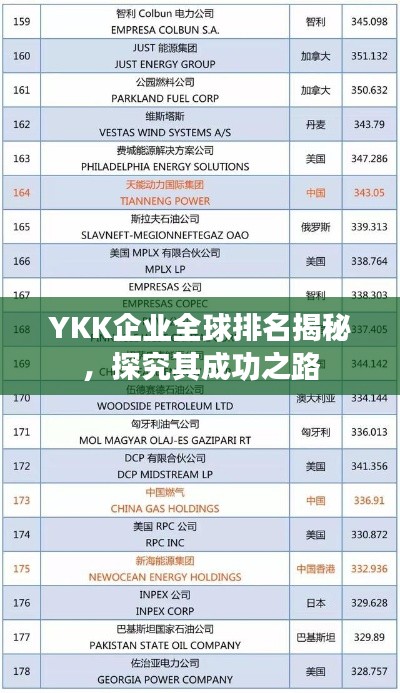 根据最新的全球企业排名数据,YKK企业在全球范围内的排名正在稳步上升,其在制造业领域的出色表现,使其在各类排行榜中名列前茅,值得注意的是,这一排名是基于企业的多方面表现,包括市场份额、盈利能力、创新能力等综合评价得出的。