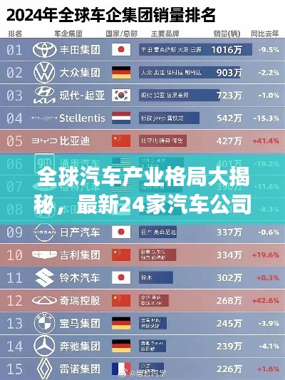24家汽车公司排名榜揭示了全球汽车产业的格局变迁,在这个变革的时代,我们需要关注全球汽车产业的发展趋势,关注创新技术和市场需求的变化,希望本文能为您提供一个全面了解全球汽车产业的角度,让您更加了解这个充满活力的行业。