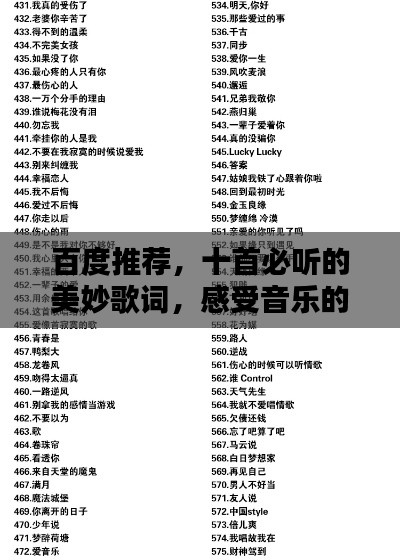 音乐是心灵的良药,它能够抚慰我们的情感,激发我们的灵感,每一首歌曲中的歌词,都是情感的载体,是歌手与听众之间沟通的桥梁,就让我们跟随百度的指引,一起探寻十首拥有优美歌词的歌曲。