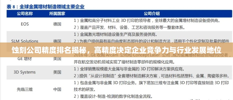 随着科技的飞速发展,蚀刻工艺在制造业中的地位日益重要,蚀刻公司的精度排名不仅反映了其在行业内的技术实力,更直接关系到产品质量和客户满意度,本文将探讨蚀刻公司的精度排名及其背后的意义。