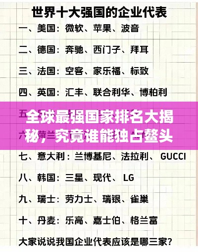 转载请注明来自马鞍山同杰良,本文标题:《全球最强国家排名大揭秘,究竟谁能独占鳌头?》