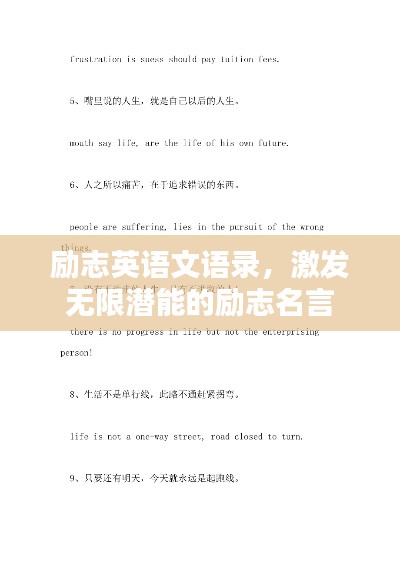 在人生的旅途中,我们时常需要一些励志的话语来鼓舞自己,激发内心的力量,英语文语录以其独特的魅力和深刻的内涵,给我们带来了无尽的启示和动力,以下是一些励志的英语文语录文案,愿它们能陪伴你走过人生的每一个阶段,激励你不断前行。