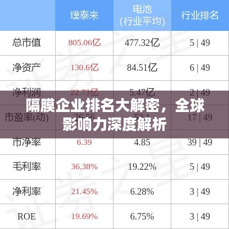 在全球隔膜行业的舞台上,各大企业凭借其卓越的技术实力、产品质量和服务水平,赢得了市场的广泛认可,本文将为您揭晓隔膜世界的企业排名,以及它们在全球市场的影响力。