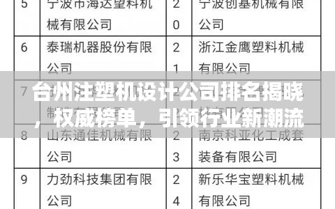 注塑机是现代工业中不可或缺的重要设备,尤其在制造业领域有着广泛的应用,随着市场的不断发展和技术的不断进步,注塑机行业也在逐渐壮大,在众多的注塑机设计制造公司中,台州地区的注塑机设计公司在市场上占有一定的地位,本文将介绍台州注塑机设计公司的排名及相关情况。