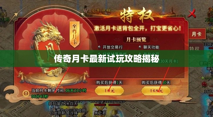 随着网络游戏的飞速发展,越来越多的玩家投入到各种游戏的世界中。“传奇”系列游戏以其独特的魅力,吸引了大量玩家的关注,传奇游戏推出了新的月卡试玩活动,让玩家们在享受游戏乐趣的同时,还能获得更多的福利,本文将为大家带来最新的传奇月卡试玩攻略,帮助大家在游戏中更好地体验。