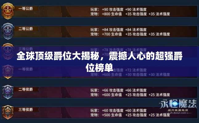 在全球历史长河中,各个国家和地区都存在着不同的爵位制度,这些爵位不仅代表着贵族的地位和荣誉,更是对个体贡献和权力的认可,本文将对世界上一些最强的爵位进行排名,以展示其历史、文化和政治价值。