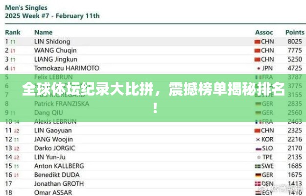 在世界体坛中,各项纪录的创造与打破一直是激发人们热情与关注的重要事件,从田径到游泳,从篮球到足球,这些纪录见证了运动员们的卓越才华与不懈努力,本文将带你了解世界体坛各个项目的纪录排名。