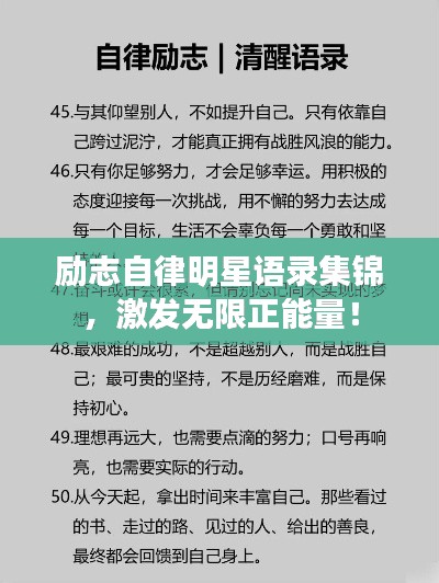 本文为您呈现了“励志自律明星语录大全”,希望能为您带来正能量,让您在人生的旅途中更加坚定信心,勇往直前,自律是我们实现梦想的基石,让我们共同追求更好的自己。