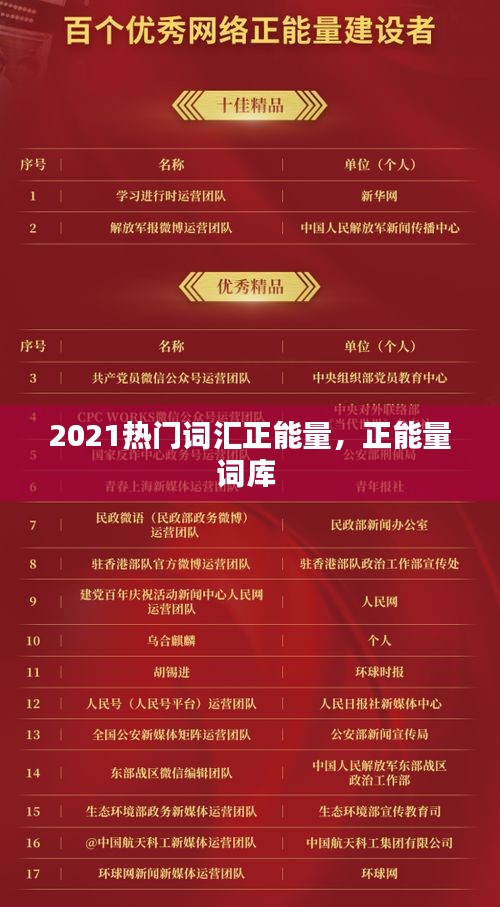 2021年,正能量词汇如同一盏盏明灯,照亮了人们前行的道路。这些词汇不仅反映了这一年中的热点事件,更传递了人们对美好生活的向往和追求。让我们携手共进,用正能量词汇点亮希望之光,共创美好未来。
