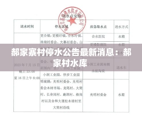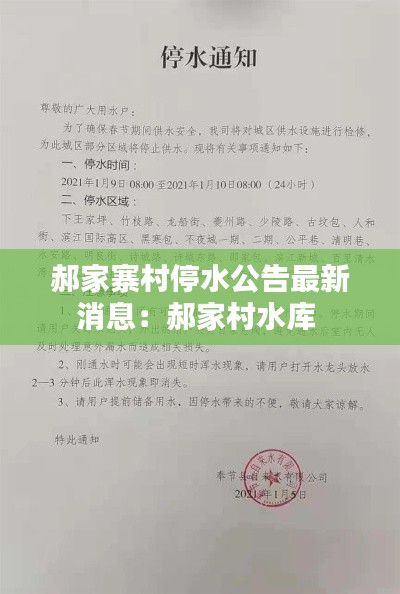 根据我村供水站的最新通知,现将关于郝家寨村停水情况的最新消息公告如下,请大家提前做好准备,确保生活不受影响。