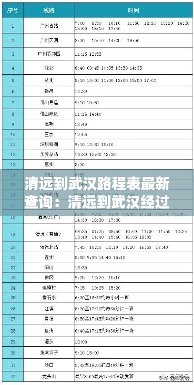 随着交通网络的不断完善,越来越多的人选择自驾或乘坐公共交通工具出行。对于从清远到武汉的旅客来说,了解最新的路程表信息对于规划行程至关重要。本文将为您提供清远到武汉的最新路程表查询,帮助您更好地安排行程。