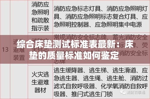 综合床垫测试标准表是对床垫各项性能的全面评估,包括舒适性、支撑性、耐用性、环保性等多个方面。以下是对这些测试标准的简要介绍: