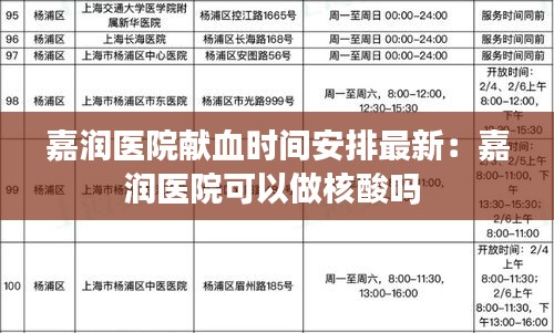 嘉润医院一直以来都致力于为社会提供全面的医疗服务,其中包括定期举办的献血活动。为了方便广大爱心人士参与,现将嘉润医院最新的献血时间安排公布如下,希望大家踊跃参与,为公益事业贡献自己的一份力量。