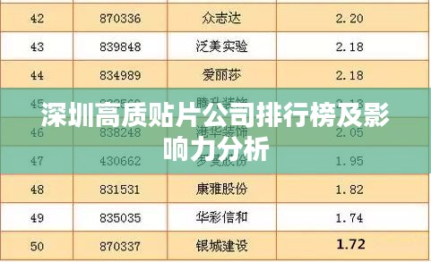 随着电子产业的飞速发展,贴片加工行业在深圳这片创新热土上蓬勃发展,众多高质的贴片公司如雨后春笋般涌现,为全球的电子产业提供优质的加工服务,本文将为您详细介绍深圳高质贴片公司的排名及其影响力。