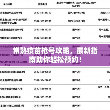随着新冠疫情的持续发展,疫苗接种已成为防控疫情的重要措施之一,常熟地区作为人口密集区域,疫苗供应紧张情况较为普遍,为了广大市民能够顺利接种新冠疫苗,本文将为大家提供一份最新的常熟疫苗抢号攻略。