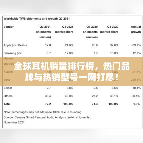 随着科技的不断发展,耳机已经成为我们日常生活中不可或缺的电子产品之一,无论是音乐爱好者还是商务人士,耳机都扮演着重要的角色,本文将对全世界耳机销量排名进行介绍,带您了解哪些品牌在市场上占据领先地位。