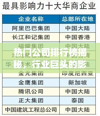 随着全球经济的快速发展,各行各业的公司如雨后春笋般涌现,竞争日益激烈,在这个日新月异的商业环境中,哪些公司脱颖而出,成为众人瞩目的焦点?本文将根据最新的数据和分析,揭示热门公司排名,探讨行业巨头的影响力与竞争力。