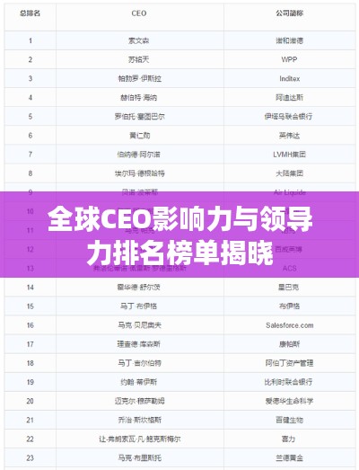随着全球化的深入发展,各行各业的CEO(首席执行官)们的影响力日益扩大,他们不仅负责引领公司的发展,更是全球商业领域的核心人物,这些商业领袖在全球范围内的排名如何呢?本文将为您揭示全球CEO排名的情况,带您了解这些商业领袖的影响力和领导力。