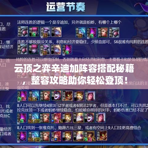 随着游戏版本的更新,云顶之弈的阵容搭配也在不断变化,本文将为大家带来关于“辛迪加”阵容的最新整容攻略,帮助玩家更好地适应游戏节奏,提升战斗能力。