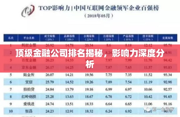 顶级金融公司的排名及其影响力反映了全球金融市场的竞争格局和发展趋势,这些公司在经济发展、风险管理、业务创新等方面表现出色,对全球金融市场具有举足轻重的地位,随着科技的进步和金融市场的发展,顶级金融公司将继续发挥重要作用,推动全球经济的繁荣和发展。