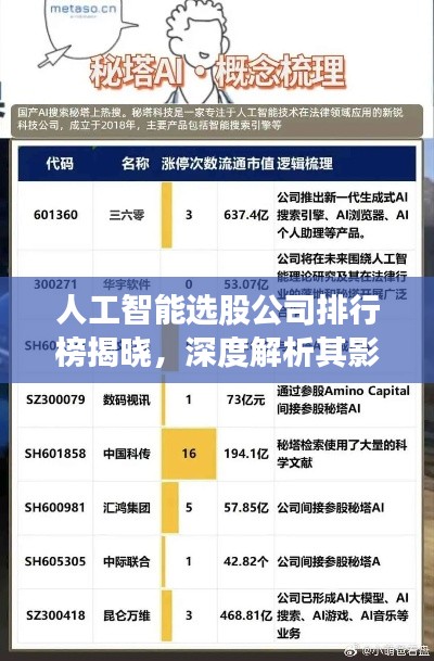随着科技的飞速发展,人工智能技术在金融领域的应用日益广泛,人工智能选股系统以其精准的数据分析能力和高效的算法模型,成为了投资者们关注的焦点,本文将针对当前市场上的人工智能选股公司进行排名,并对其影响力进行深入分析。