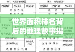 当我们谈论世界面积各国排名时,我们是在探讨全球各个国家领土面积的规模,这种排名不仅反映了各国自然地理的特点,也揭示了全球政治、经济和文化的发展历史,本文将为您详细介绍世界面积排名靠前的几个国家,并探讨其背后的地理故事。