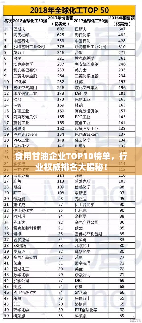 甘油,作为一种重要的有机化工原料,在食品、医药等领域有着广泛的应用,随着市场需求的不断增长,食用甘油行业得到了快速发展,本文将介绍食用甘油企业排名前十名,以供参考。