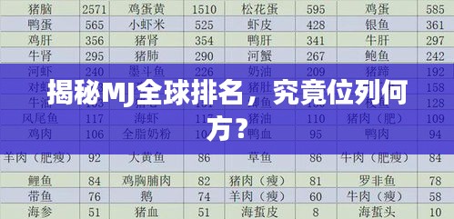 关于MJ的世界排名,实际上并没有一个固定的数字,因为排名的标准多种多样,可能涉及到各个领域,在音乐领域,MJ无疑是流行音乐之王的代表,其排名无疑是非常高的,而在其他领域,如体育、影视等,MJ也可能因为其杰出的表现而跻身前列。