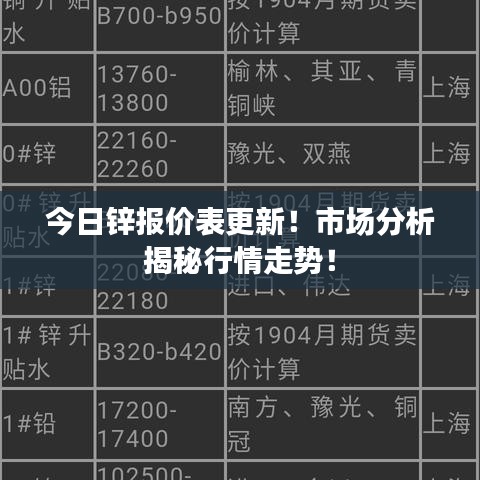 随着全球经济一体化的进程加速,锌等有色金属的价格波动成为了全球关注的焦点,本文旨在为广大投资者提供最新的锌报价表以及相关的市场分析。