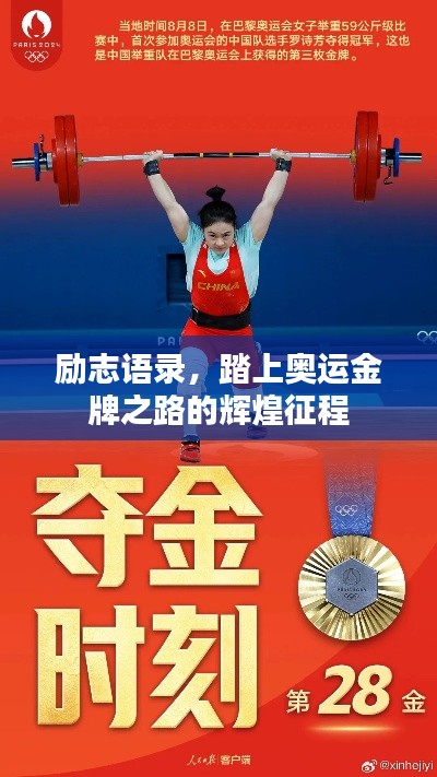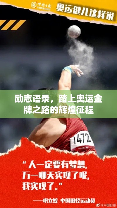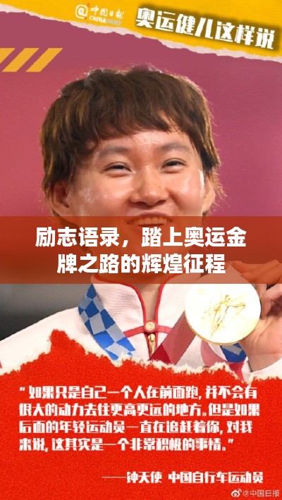 追求奥运金牌的过程是一场人生的奋斗和拼搏,在这条路上,我们需要坚定信念,勇往直前,刻苦训练,团结协作,超越自我,保持平和的心态,不断进取,成功并非偶然,而是努力的结果,让我们在励志语录的鼓舞下,踏上奥运金牌之路,追求人生的梦想和荣誉。