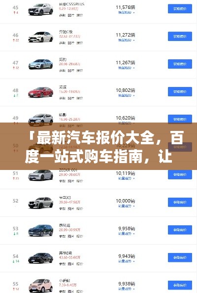“百度一下汽车报价大全”将为您的购车决策提供有力支持,帮助您轻松找到心仪的车型,祝您购车愉快!