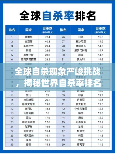 自杀是一个全球性的公共卫生问题,对个人、家庭和社会产生深远影响,根据最新数据,世界自杀率排名反映了全球自杀现象的严峻挑战,本文将探讨2022年世界自杀率的现状,并寻求降低自杀率的策略和方法。