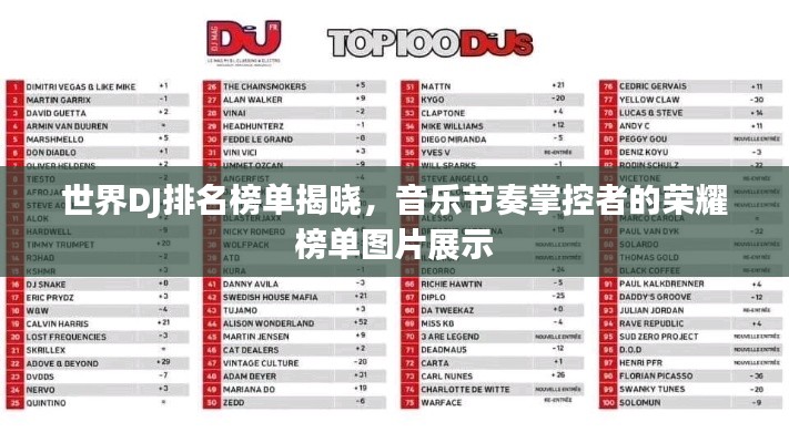 在当今的娱乐产业中,DJ(Disc Jockey)已经成为了一种独特的文化符号,他们通过精准的混音技巧和激情四溢的表演,将音乐带给观众,掌控着舞池中的气氛,随着全球范围内DJ文化的普及和发展,世界DJ排名图片也成为了许多人关注的焦点,本文将带你了解世界知名DJ的排名,欣赏他们的风采。