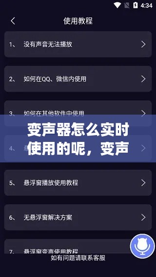 变声器实时使用的基本原理是通过捕捉用户的原始声音,然后对其进行处理,最后输出改变音调的声音。以下是这一过程的基本步骤: