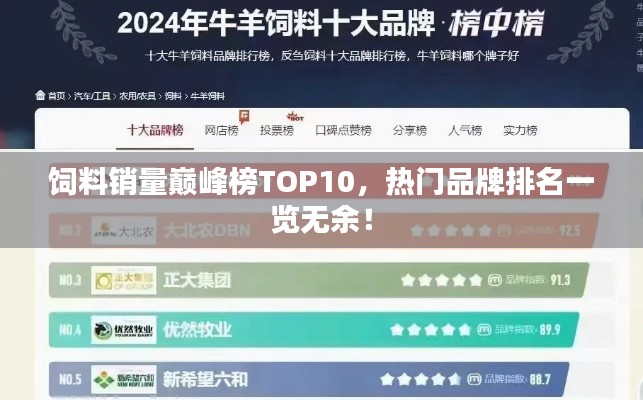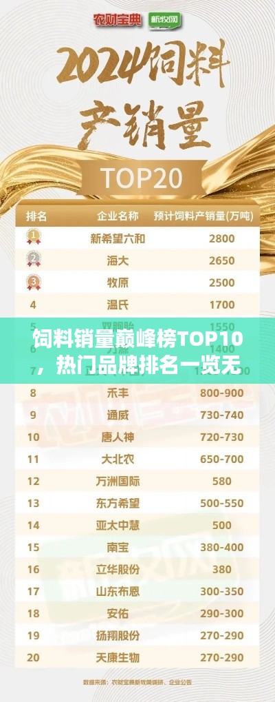 随着畜牧业的繁荣与发展,饲料市场也日渐壮大,在众多饲料品牌中,有一些品牌因其卓越的品质和良好的口碑而备受消费者青睐,本文为您带来饲料排名前十名销量榜,让我们一起了解这些在市场中表现突出的品牌。
