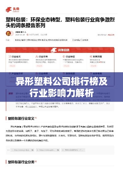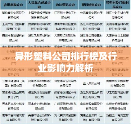 随着科技的不断发展,塑料行业也在逐渐壮大,异形塑料作为塑料行业的一个重要分支,其市场需求日益增加,本文将介绍异形塑料公司的排名及其行业影响力,让读者更好地了解该领域的现状和发展趋势。