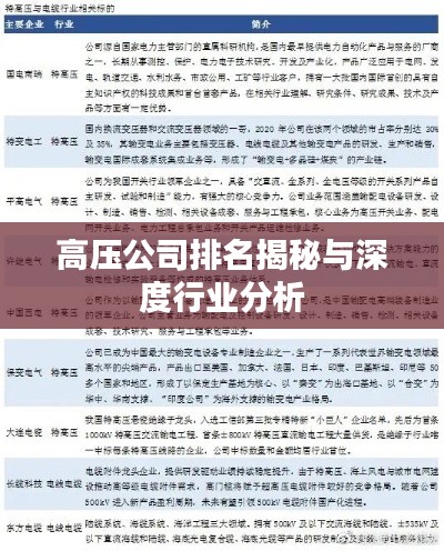 随着电力需求的不断增长和电网建设的不断完善,高压电器行业逐渐崭露头角,本文将探讨全球范围内的高压公司排名及相关行业分析,旨在为读者提供全面的市场概览和行业洞察。