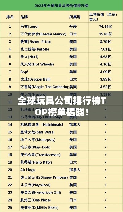 玩具行业是儿童成长过程中的重要组成部分,也是全球消费品市场的重要支柱之一,随着全球经济的发展和人们对娱乐需求的不断增长,玩具行业逐渐壮大,玩具公司也在全球范围内展开竞争,本文将介绍全球玩具公司的排名及相关情况。