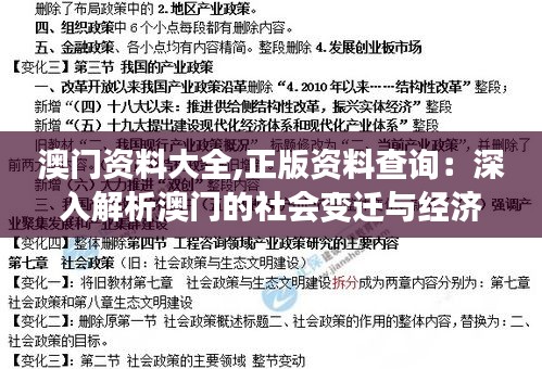 澳门资料大全,正版资料查询,深入解析澳门的社会变迁与经济发展趋势提供了一本综合、全面的澳门研究文献。该文献覆盖了澳门从历史发展到现代社会的各个重要阶段,尤其是在其社会和经济领域的演变。资料收集和整理了自澳门回归以来,如何在维护其独特的文化和传统基础上,实现经济和社会的快速发展,并展望未来的发展趋势。