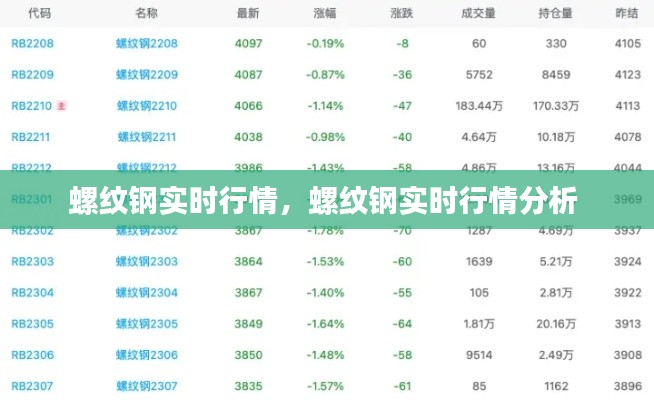 螺纹钢的实时行情可以通过多种渠道获取,包括专业的金融信息服务网站、证券交易所的实时数据服务以及各大新闻媒体的报道。以下是一些常见的螺纹钢实时行情指标: