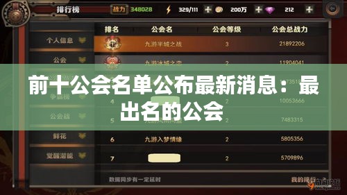 随着电子竞技行业的蓬勃发展,各大公会之间的竞争也愈发激烈。经过长时间的努力和激烈的角逐,我们终于迎来了一个激动人心的时刻——前十公会名单正式公布!以下是本次公布的详细名单和相关分析。