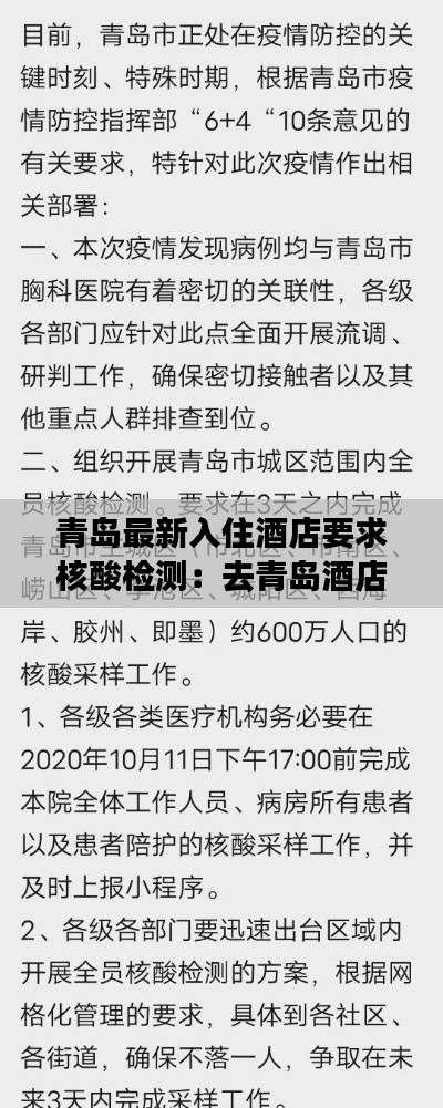 随着全球新冠疫情的持续发展,我国各地疫情防控措施也在不断升级。为了保障人民群众的生命安全和身体健康,各地纷纷出台了一系列严格的防控政策。近期,青岛市针对酒店入住者发布了最新的要求,即所有入住酒店的人员必须进行核酸检测。