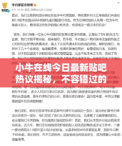 小牛在线今日在贴吧上成为热议的焦点,凭借其新产品上线、贴吧活动等动态赢得了用户的关注,广大用户对小牛在线的专业性和安全性表示认可,并积极参与贴吧活动,展望未来,小牛在线将继续创新产品和服务,加强风险控制,为用户提供更优质的金融服务。