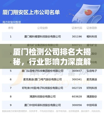 厦门,这座美丽的海滨城市,不仅是旅游胜地,也是众多检测公司竞相发展的热土,随着科技的进步和产业的发展,检测行业在厦门日益壮大,涌现出一批具有影响力的检测公司,本文将为您介绍厦门检测公司的排名及其行业影响力。