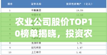 随着农业科技的发展和全球对食品安全问题的日益关注,农业行业的发展前景日益明朗,农业公司股价的走势也反映了这一行业的繁荣,本文将为您介绍农业公司股价排名前十名,带您了解这一领域的投资热点。